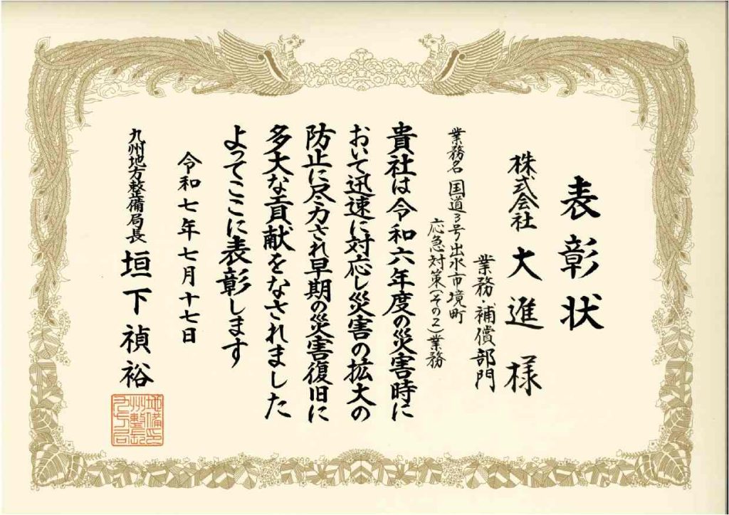 九州地方整備局国土交通行政功労表彰 災害復旧等功労業者(業務・補償部門)を受賞しました。