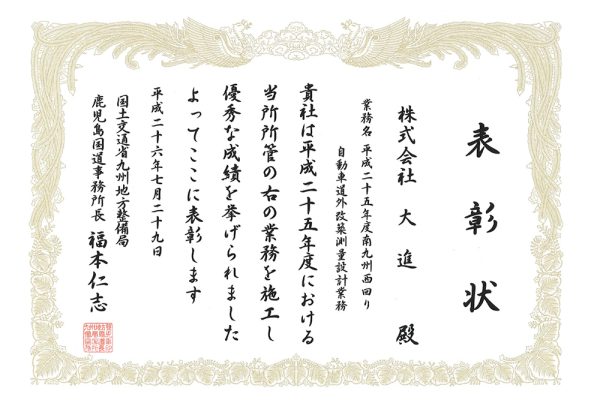 新着情報 受賞・表彰 2020年8月6日 鹿児島国道事務所 事務所長表彰 優秀技術者(業務部門)を受賞しました。 受賞・表彰 2020年8月5日 川内川河川事務所 事務所長表彰 優良施工業者(業務部門)を受賞しました。 受賞・表彰 2020年8月5日 大隅河川国道事務所 事務所長表彰 優秀技術者(業務部門)を受賞しました。 受賞・表彰 2019年8月9日 鶴田ダム管理所管理所長表彰を受賞しました。 受賞・表彰 2019年1月30日 鶴田ダム再開発事業感謝状を頂きました 受賞・表彰 2017年7月28日 鹿児島国道事務所 事務所長表彰 優良施工業者(業務部門)を受賞しました。 受賞・表彰 2017年7月28日 大隅河川国道事務所 事務所長表彰 優良施工業者(業務部門)を受賞しました。 受賞・表彰 2017年7月28日 大隅河川国道事務所 事務所長表彰 優秀技術者(業務部門)を受賞しました。 受賞・表彰 2017年7月21日 九州地方整備局国土交通行政功労表彰 優秀技術者(業務部門)を受賞しました。 受賞・表彰 2016年6月28日 公共測量品質管理優秀賞(基準点)を受賞しました。 受賞・表彰 2015年10月5日 鹿児島県土木部長表彰(業務表彰)を受けました。 受賞・表彰 2015年7月22日 鹿児島国道事務所所長表彰(業務表彰)を受けました。 受賞・表彰 2015年7月10日 国土交通大臣表彰を受けました。 受賞・表彰 2015年6月18日 優良安全運転事業所表彰を受けました。 受賞・表彰 2014年7月29日 事務所長表彰 (優良業務表彰)を受けました。 受賞・表彰 2014年7月29日 事務所長表彰 (優秀技術者表彰)を受けました。